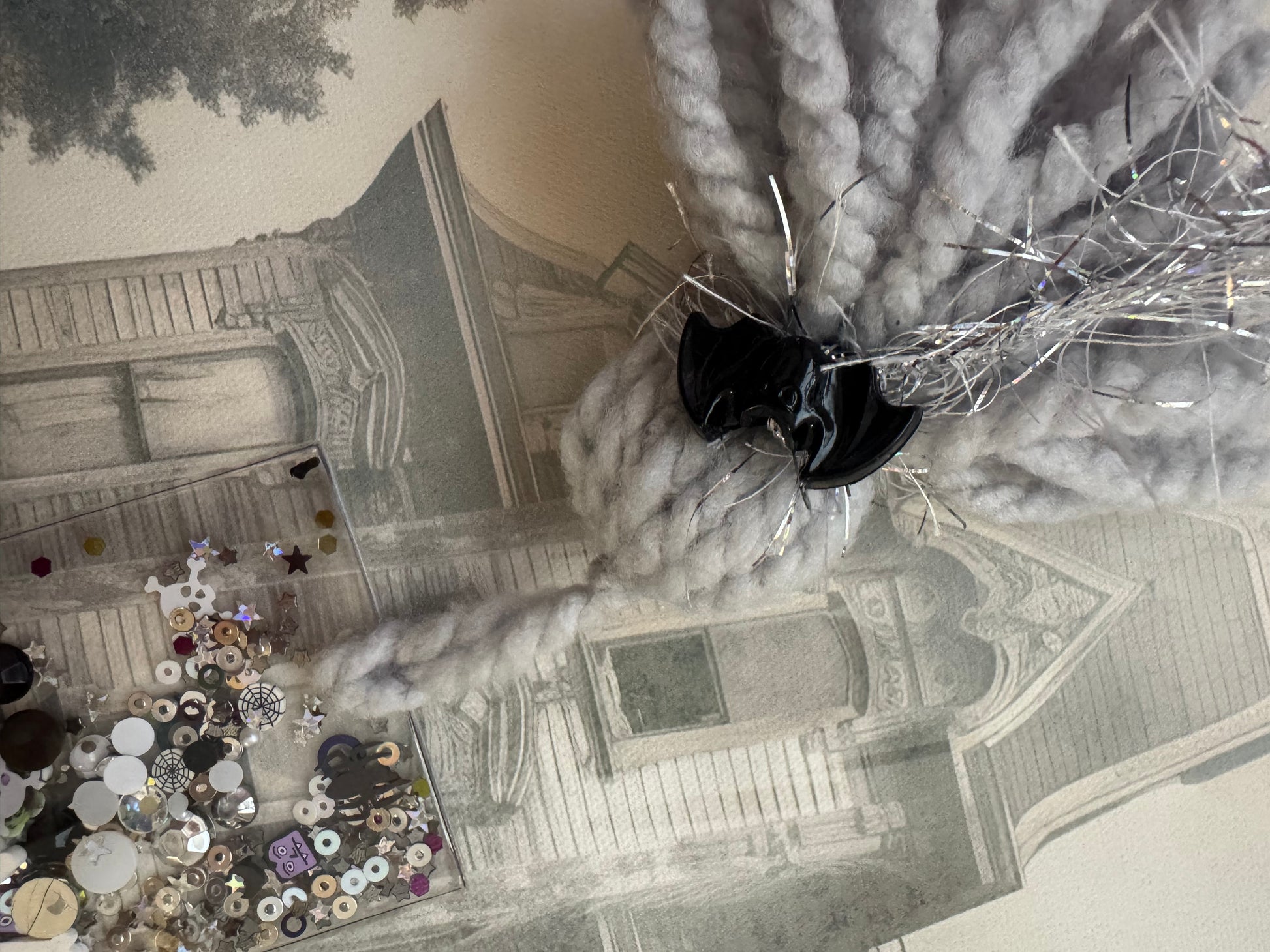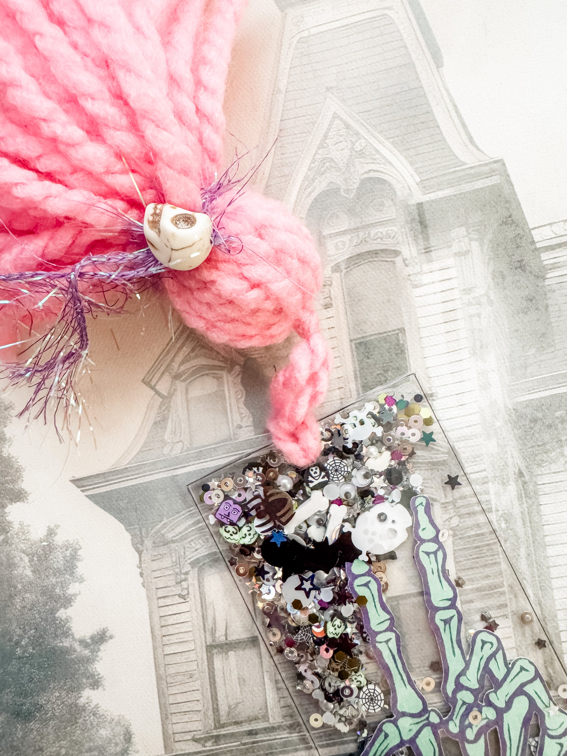 - Choice of a whimsical gray tassel with a bat bead and sparkly silver yarn tassel or a bright pink tassel with a skull bead and purple fringe